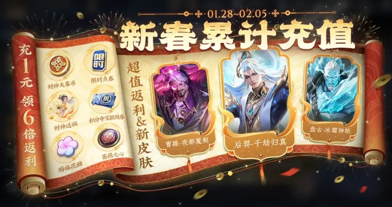 蛇年春节期间的特别版充值活动,需要19888档位才能拿满所有的奖励,包含限时点券,优惠券,蔷薇之心和后羿新皮肤。