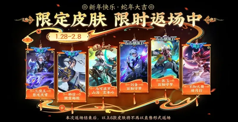 还有返场皮肤,去年是傲雪梅枪+玄木吟+刘备百相守梦+绯月行+影龙天宵+张飞百相守梦。