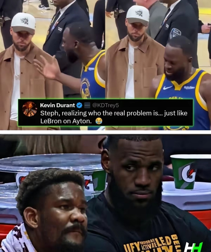 更有意思的是杜兰特还顺带嘲讽了一把自己的老队友艾顿,把库里看向格林的眼神和詹姆斯看向艾顿的眼神做了对比,简直是一样的嫌弃和不满。